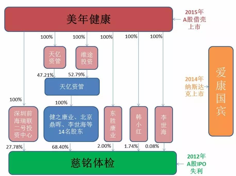 慈铭体检早在2012年就曾冲击A股IPO上市,终因证监会加强发行监管审核、IPO暂停等失利。爱康国宾则于2014年率先在纳斯达克上市,成为中国健康体检行业上市第一股。2014年11月,慈铭体检与美年健康签订股权转让协议,拟分两次向美年健康转让100%股权。随后,美年健康受让慈铭体检27.78%股权。