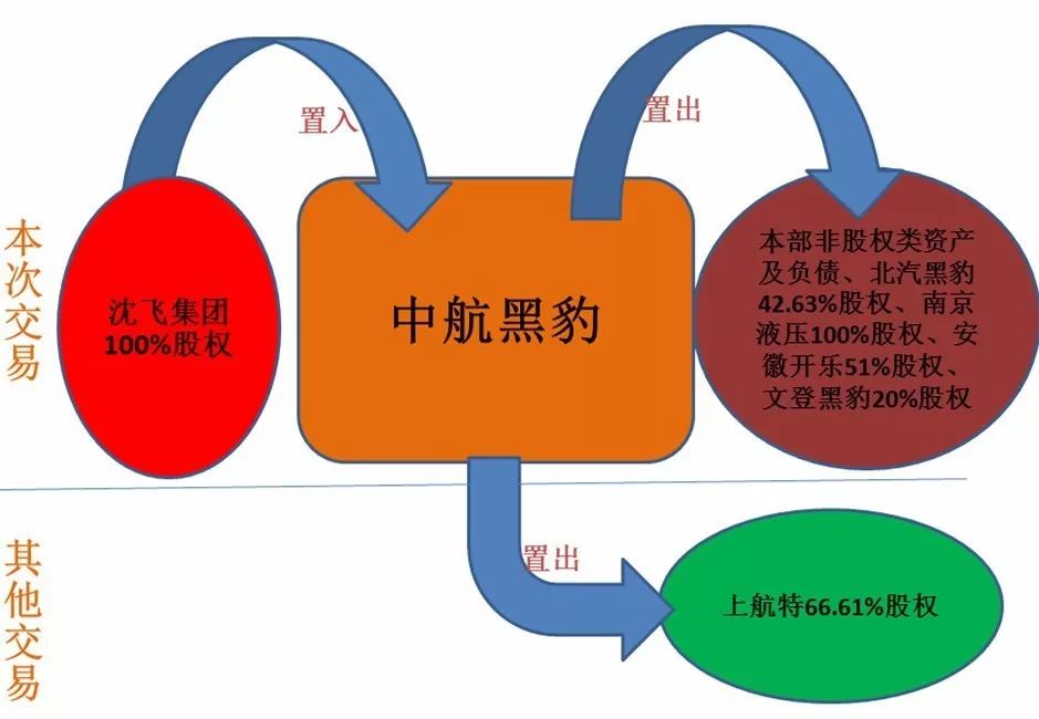 本次重组,中航黑豹将以现金方式向金城集团出售截至2016年8月31日除上航特66.61%股权外的全部资产及负债,具体包括本部非股权类资产及负债、北汽黑豹42.63%股权、南京液压100%股权、安徽开乐51%股权、文登黑豹20%股权。拟出售资产的评估值为5.38亿元。并将以发行股份方式作价79.80亿元,向中航工业、华融公司购买其合计持有的沈飞集团100%股权。